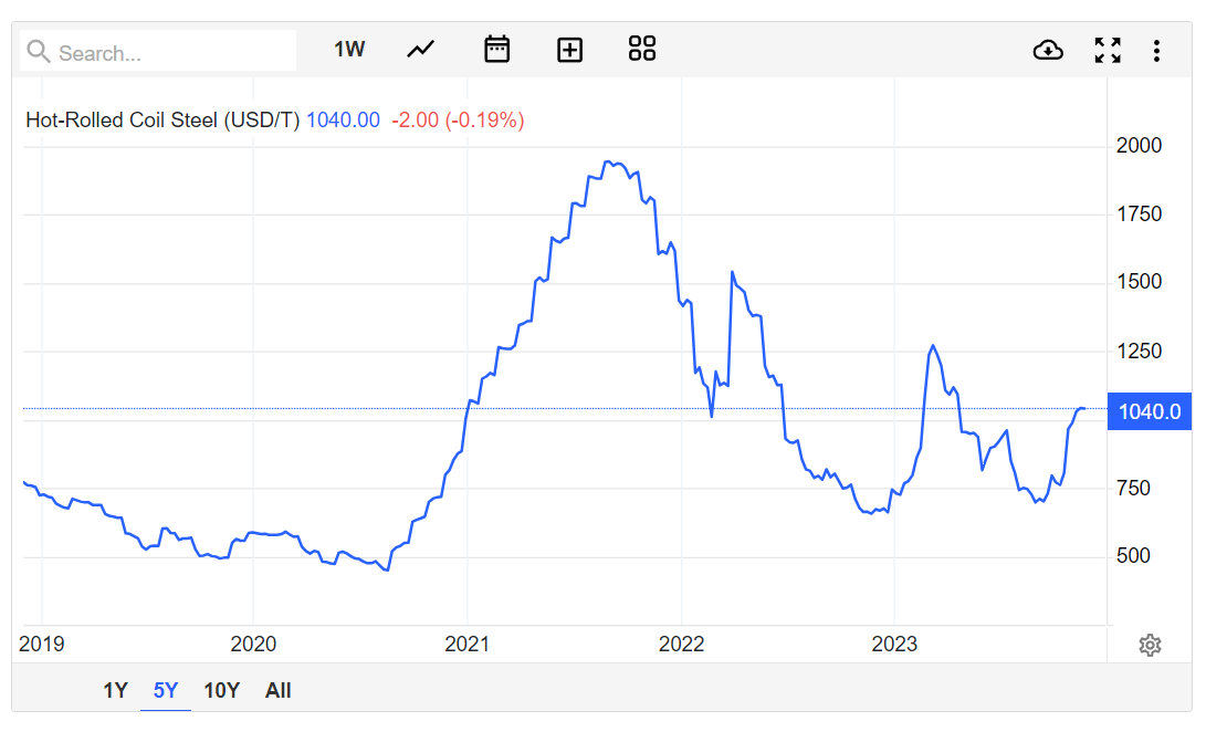 Giai đoạn năm 2020 - 2021 là thời kỳ hoàng kim của các doanh nghiệp Thép khi giá HRC tăng lên gần 2000 (USD/T), làm cho các doanh nghiệp thép có lợi nhuận khủng.