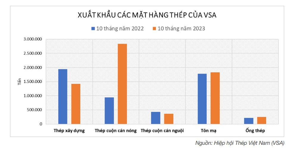 Còn theo số liệu của Hiệp hội Thép Việt Nam (VSA), tổng xuất khẩu thép của các thành viên VSA 10 tháng năm 2023 đạt trên 6,7 triệu tấn thép các loại, tăng trưởng 26,1% so với cùng kỳ năm 2022. Trong đó dấu ấn tăng trưởng 201% so với cùng kỳ năm 2022 ghi nhận ở mặt hàng thép cuộn cán nóng (HRC) với mức sản lượng xuất khẩu đạt trên 2,8 triệu tấn; tiếp sau đó là xuất khẩu Tôn mạ đạt trên 1,8 triệu tấn, tăng trưởng 2,8%; Ống thép đạt 0,25 triệu tấn, tăng trưởng 17%. Hai mặt hàng xuất khẩu giảm mạnh so với cùng kỳ là thép xây dựng đạt 1,4 triệu tấn giảm 27% và thép cuộn cán nguội đạt 0,36 triệu tấn giảm 16,4%.