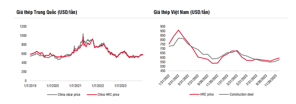 Do đó, ta kỳ vọng giá thép có thể đã chạm đáy và sẽ phục hồi trong thời gian tới: Tuy nhiên, ta không kỳ vọng giá thép sẽ tăng mạnh vì nhu cầu chung vẫn sẽ bị ảnh hưởng bởi nhu cầu yếu ở Trung Quốc do thị trường bất động sản chưa có nhiều khởi sắc. Mặt khác, sự gia tăng giá thép so với chi phí nguyên liệu đầu vào có thể thúc đẩy hoạt động sản xuất ở Trung Quốc quay trở lại.