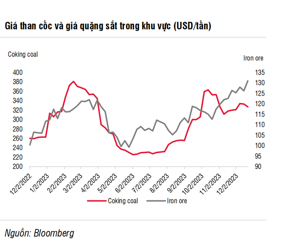 Chi phí đầu vào tăng có thể làm giảm biên lợi nhuận trong ngắn hạn nếu nhu cầu chậm lại: Giá than cốc và quặng sắt đã tăng lần lượt 18% và 27% trong 4 tháng qua, nguyên nhân là do sản lượng nhập khẩu của Trung Quốc tăng (+6% svck trong 11T2023), tình trạng dự trữ theo mùa của các công ty thép và chi phí sản xuất và vận chuyển gia tăng. Việc chi phí đầu vào tăng có thể gây áp lực lên biên lợi nhuận của các công ty như HPG trong những tháng đầu năm 2024. Tuy nhiên, việc tăng tỷ trọng sản lượng xuất khẩu có thể giúp công ty chuyển phần tăng chi phí đầu vào vào giá bán thép dễ dàng hơn. Ngoài ra, sự kỳ vọng áp lực từ chi phí đầu vào cao có thể giảm dần trong dài hạn khi tác động của việc tích trữ giảm dần. Nguồn cung quặng sắt dự kiến sẽ ổn định trong năm tới. Các nhà cung cấp quặng sắt lớn dự kiến sẽ duy trì hoặc tăng sản lượng trong năm 2024. Rio Tinto dự kiến sản lượng quặng sắt sẽ tăng lên khoảng 323-338 triệu tấn trong năm 2024, từ khoảng 320-335 triệu tấn trong năm 2023. Vale dự kiến sẽ duy trì sản xuất khoảng 310-320 triệu tấn trong năm 2024, so với khoảng 315 triệu tấn trong năm 2023.