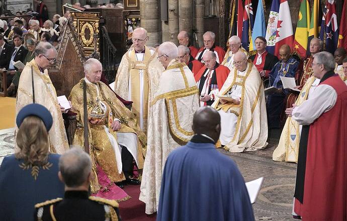 Ngay trước khi đăng quang, Vua Charles III đã được xức dầu để trị vì. Thánh lễ được cử hành bởi Tổng Giám mục Canterbury Justin Welby tại Tu viện Westminster ở London. Từ con mắt của 2.200 khách mời của buổi lễ và hàng triệu người xem trên toàn thế giới, nó đã bị che khuất bởi một màn hình đặc biệt.