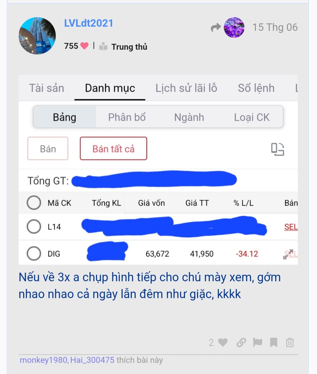 Bác CL nhotho9x đâu nhỉ, vào chào nhau cái, nhớ lại comment cách đây 2 tháng trc nhắn cho bác đó, kkkk, lúc đó Tk Dig lõm gần 40% ,vãi chưởng, kkkk
