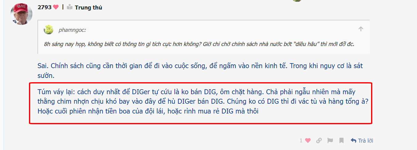 Túm váy lại: cách duy nhất để DIGer tự cứu là ko bán DIG, ôm chặt hàng. Chả phải ngẫu nhiên mà mấy thằng chim nhợn chịu khó bay vào đây để hù DIGer bán DIG. Chúng ko có DIG thì đi vác tù và hàng tổng à? Hoặc cuối phiên nhận tiền boa của đội lái, hoặc rình mua rẻ DIG mà thôi