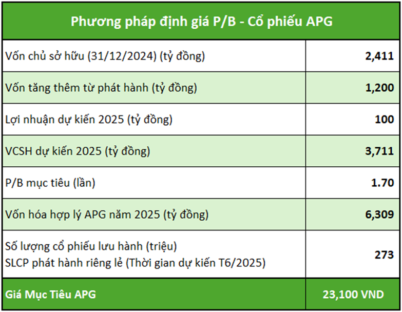 Tôi sử dụng phương pháp định giá P/B đối với cổ phiếu APG và lấy P/B mục tiêu cho 12 tháng tới là 1.7 lần (Trung bình ngành 5 năm)