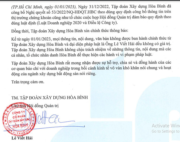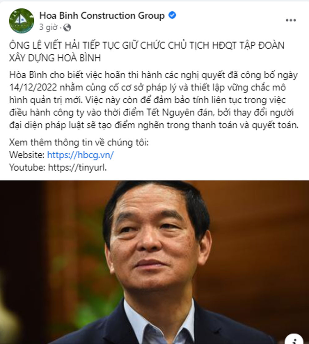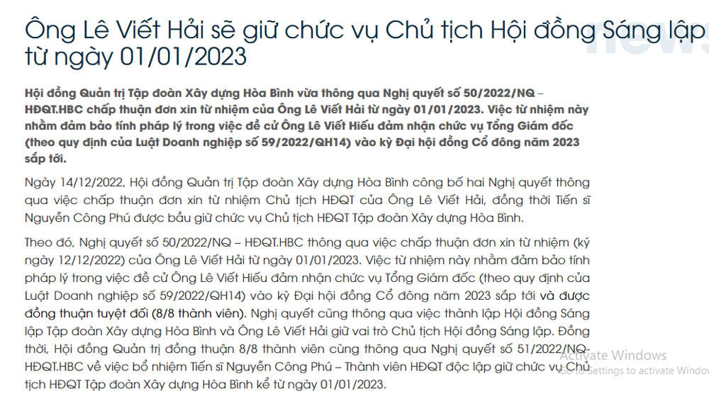 Nhận thấy các vấn đề nghiêm trọng như vậy, chúng tôi dự tính miễn nhiệm Chủ tịch HĐQT đối với ông Lê Viết Hải, nhưng ông Hải không chịu. Sau mấy cuộc họp, HĐQT thống nhất thành lập ra Hội đồng Sáng lập để vinh danh người sáng lập và tận dụng những kinh nghiệm của ông Hải. Đồng thời, bầu Chủ tịch HĐQT mới để điều hành con tàu Hòa Bình đi qua lúc khó khăn này, nhằm bảo vệ quyền lợi cho các cổ đông, giữ lại thương hiệu Hòa Bình và giữ công ăn việc làm cho hàng nghìn người lao động, đảm bảo đời sống cán bộ công nhân viên.