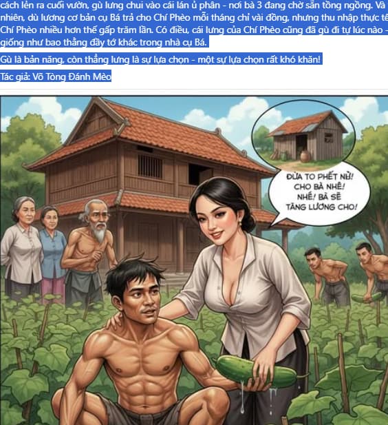 “Cho bà nhé! Bà sẽ tăng lương cho!” - Bà 3 ghé tai hắn thì thào, mùi đàn bà nồng nàn cùng hơi thở gấp gáp của bà phả vào gáy khiến Chí Phèo thấy nóng ran. “Nhỡ cụ Bá về bắt được thì con chết” - Chí Phèo chống cự yếu ớt. “Không sợ! Đi theo bà!” - Nói rồi bà 3 dẫn Chí Phèo về phía cuối vườn, nơi có cái lán ủ phân. Đó là một nơi cực an toàn, chẳng ai muốn bén mảng ra đấy cả, cụ Bá lại càng không. Chỉ có điều cái lán thấp lè tè, muốn vào được thì phải cúi cho cái lưng gù xuống…