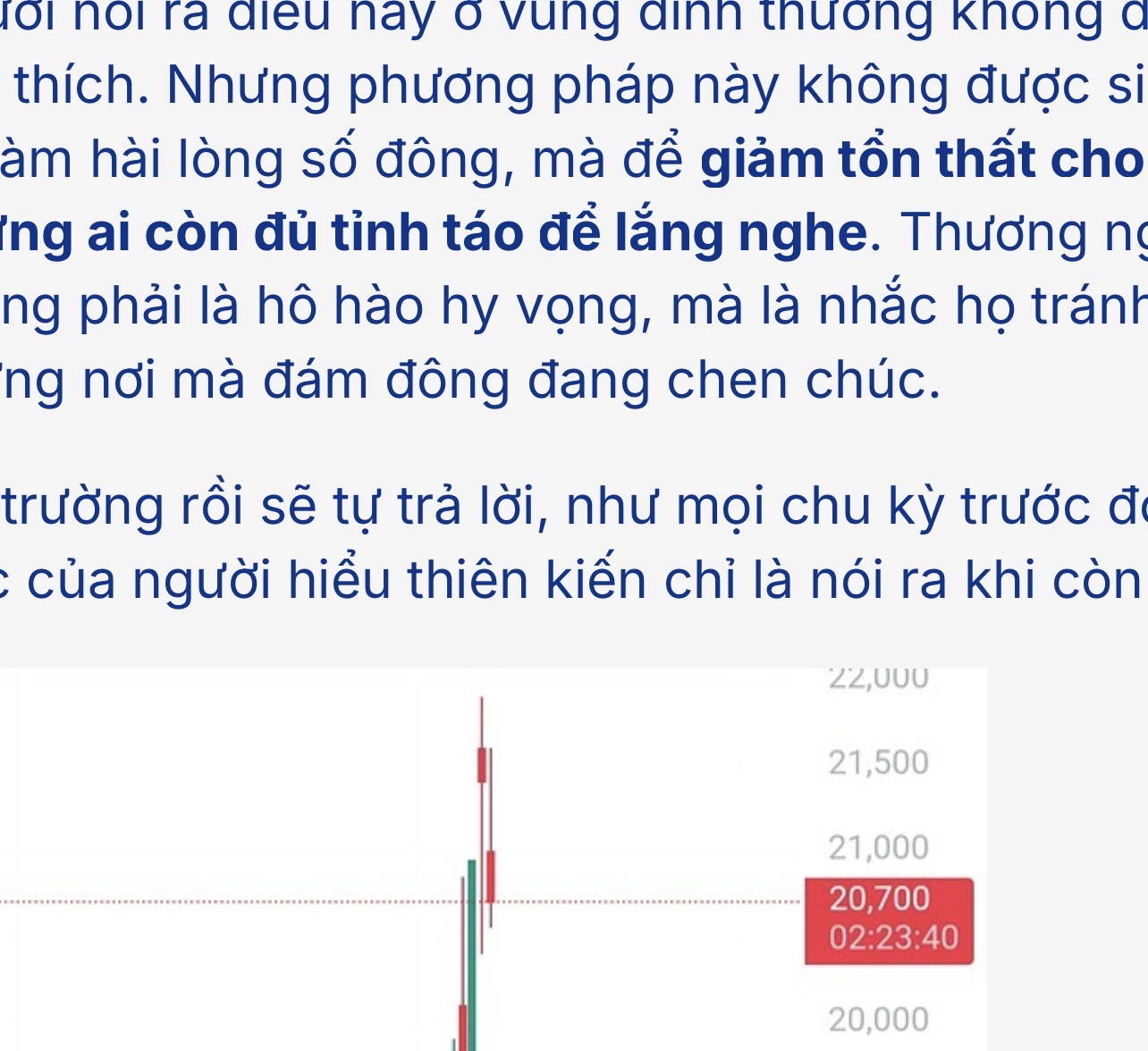 Haha lúc t cảnh báo giá đã gần 22 rồi, chỉnh xuống 20 xong lại hồi lại 22 để lấy đà tại vùng ban đầu thôi mà mấy th.ằ.ng n.g.u này mừng hết lớn nhìn thương quá, tụi m hô hào làm t tưởng giá lên 30 rồi k á, bớt ảo tưởng đi mấy cu