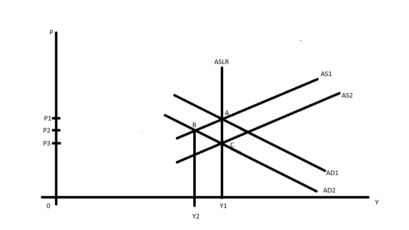 Điều này làm tăng chi phí sản xuất. Ở mỗi mức giá cho trước, các doanh nghiệp muốn bán ít hàng hoá và dịch vụ hơn. Như trong mô hình trên cho thấy, đường tổng cung ngắn hạn dịch chuyển sang trái từ AS1 đến AS2. Trong ngắn hạn, nền kinh tế di chuyển dọc theo đường tổng cầu từ điểm A đến điểm B. Sản lượng của nền kinh tế giảm từ Y1 xuống Y2 trong khi mức giá tăng từ P1 lên P2. Do nền kinh tế vừa rơi vào suy thoái(sản lượng giảm), vừa trải qua lạm phát(mức giá tăng) nên hiện tượng này được gọi là suy thoái kèm lạm phát.