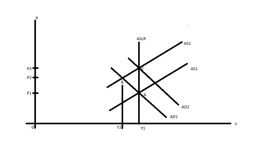 Một trong những khả năng là các nhà hoạch định chính sách có thể muốn triệt tiêu tác động của sự dịch chuyển đường tổng cung ngắn hạn đến sản lượng bằng cách tăng tồng cầu. Trong trường hợp này, thay đổi trong chính sách làm đường tổng cầu dịch chuyển từ AD1 đến AD2 vừa đủ để duy trì mức sản lượng ban đầu. Nền kinh tế chuyển đến điểm C. Sản lượng trả về mức tiềm năng và mức giá tiếp tục tăng lên P3. Quá trình từ A đến B rồi đến C chính là Thiên Kiến Mua.