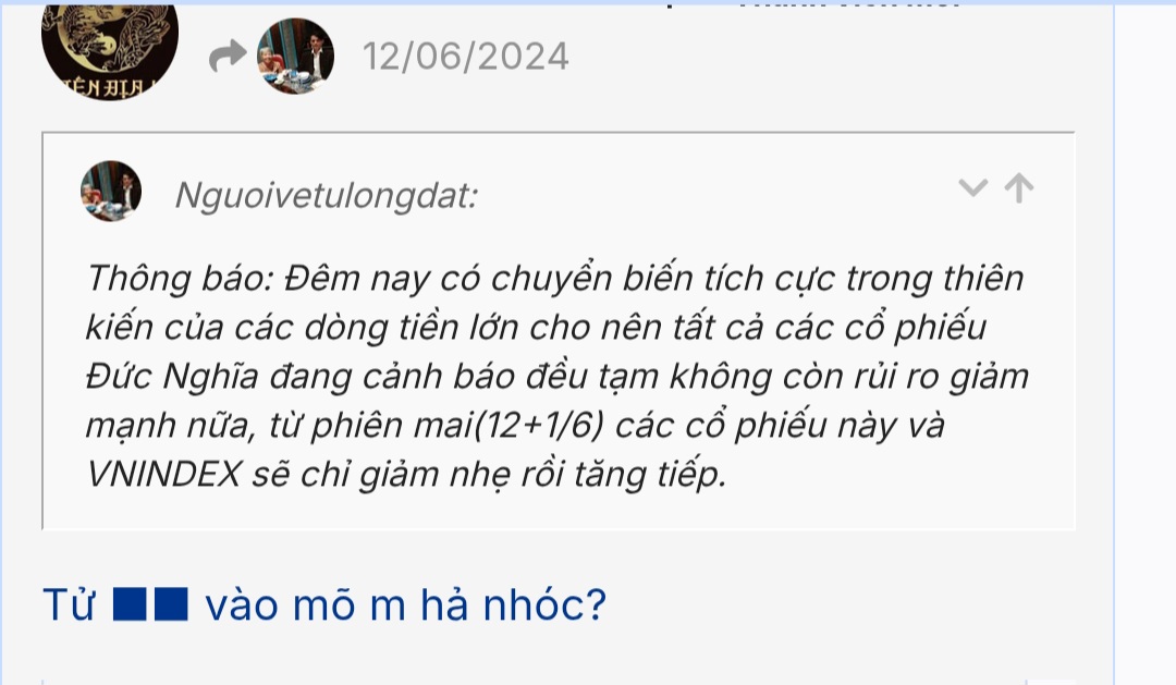 Haha vào vu khống n.g.u xong đòi tha thứ, hài quá, 12/6/24 vnindex chưa lên 1300 sau đó vài tháng chạm 1340 mà không phải tăng tiếp? Anh nói chuyện bằng số liệu thực tế chứ anh k ngáo như m