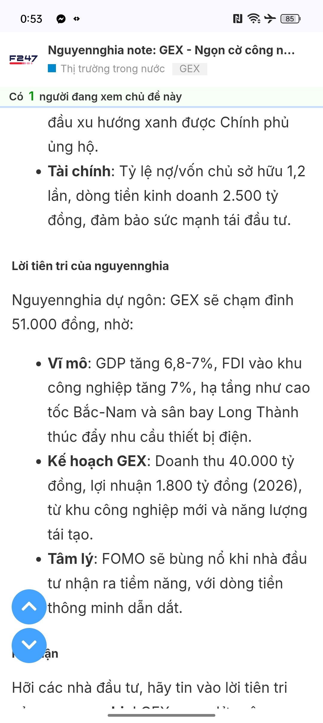Ngày 8/1/2026 bạn bảo GEX sẽ vượt đỉnh 50,nhưng từ ngày đó nó lên 44 rồi về giá 36 nè.Hôm nay là ngày 28/1/2026 nè.Ghi rõ mốc thời gian để cho nó rõ ràng nè.Thế bao giờ lên vượt 50 nè.Chưa được nửa tháng mà từ 44 mà về 36 rồi nè.Liệu có về 18 không nè,hay lên 50 nè