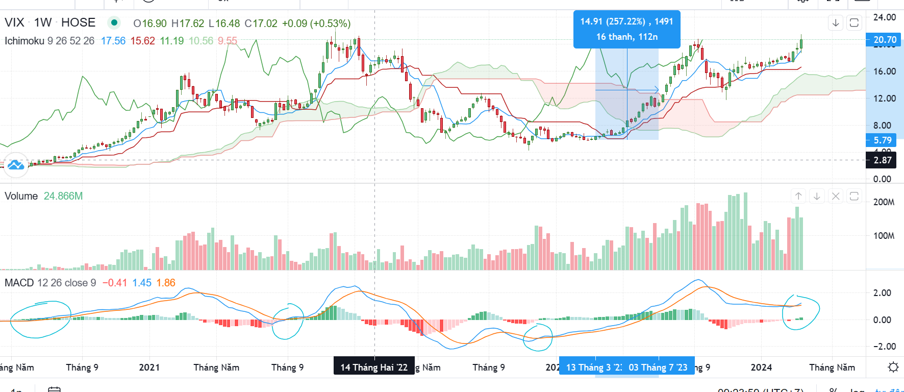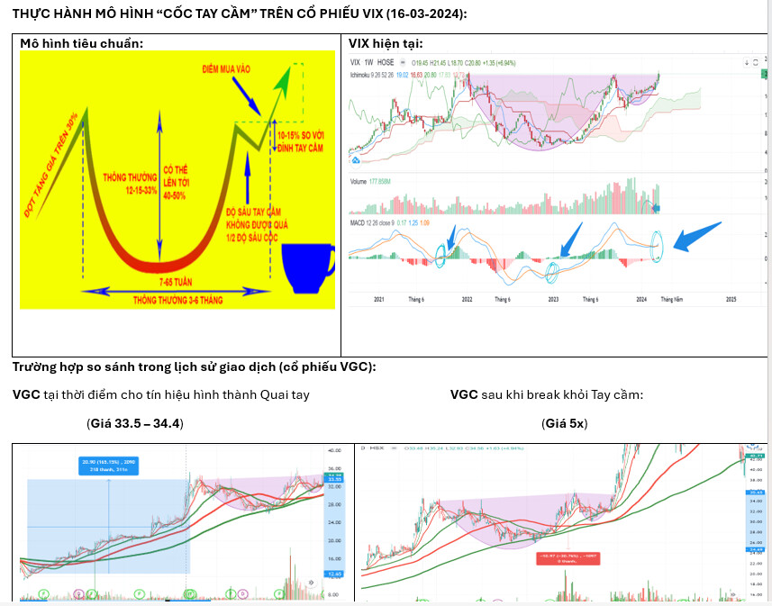 Trong 4 năm qua (2020-2024) tính ra VIX mới có 4 lần MACD dương, mỗi lần như vậy đều tăng 200-300% tính từ tuần đầu tiên. VIX đang ở tuần đầu tiên MACD dương của nhịp này, nên VIX cứ đỏ là xúc. Tôi đã nhìn thấy cái Quai tay của cái Cốc rồi.