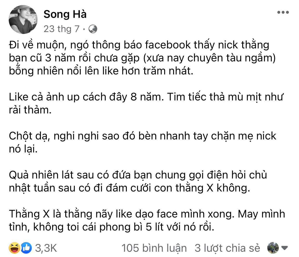 Về nhà thờ họ ăn rằm. Ngồi mâm, lõm bõm nghe em gái là phó bí thư Đoàn khoe vừa triển khai ngày hội đọc sách ở địa phương, đoán chắc em ấy không biết mình là ai, nhưng vẫn mạnh dạn hỏi rứa có biết Song Hà không.