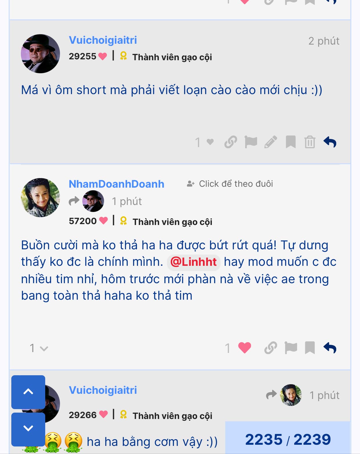 Buồn cười mà ko thả ha ha được bứt rứt quá! Tự dưng thấy ko đc là chính mình. @Linhht hay mod muốn c đc nhiều tim nhỉ, hôm trước mới phàn nà về việc ae trong bang toàn thả haha ko thả tim