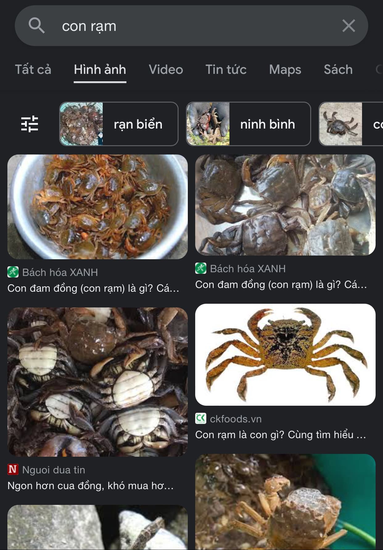 Cái con ở cái hình đó phải không.nó là con cua mà.con rạm con gì e chịu Á.chỉ có con ở quê e có con chà ké thì cũng ở suối nhưng vẫn ở hang.mà chà ké bự lắm đâu nhỏ như vậy ![]()