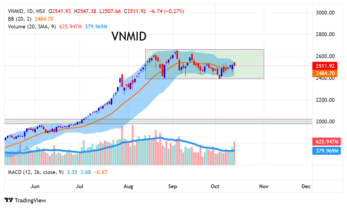 Hiện tại, nhóm VNMID đang thể hiện sự yếu hơn so với thị trường chung khi vẫn giao dịch ở vùng biên dưới của hộp tích lũy. Tuy nhiên, điểm tích cực là chỉ số midcap vẫn giữ được nền tích lũy và chưa vi phạm cấu trúc, cho thấy xu hướng trung hạn vẫn an toàn. Thanh khoản của nhóm này cũng đang dần cải thiện kể từ khi VNINDEX vượt mốc 1700 điểm, phản ánh dòng tiền bắt đầu có dấu hiệu quay lại. Giai đoạn hiện tại là thời điểm thích hợp để tích lũy dần các cổ phiếu midcap có nền giá vững và đang giữ trong biên tích lũy, chờ nhịp luân chuyển dòng tiền từ nhóm VN30 sang. Khả năng cao nhóm midcap sẽ cần thêm khoảng 2 tuần đến 1 tháng để hoàn tất quá trình tích lũy trước khi bước vào nhịp tăng mới. Khi đó, các nhóm ngành như bất động sản, bán lẻ, ngân hàng thương mại và chứng khoán sẽ là những lĩnh vực hưởng lợi mạnh nhất từ dòng tiền lan tỏa.