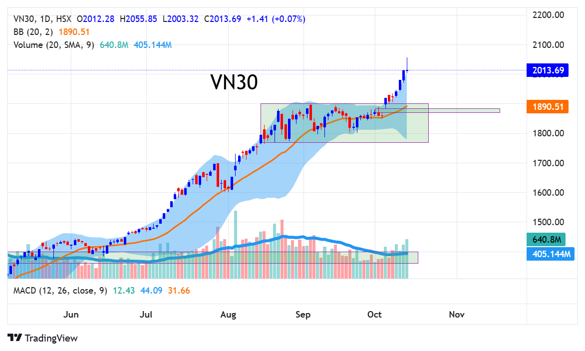 Sau khi VN30 bứt phá khỏi vùng tích lũy trước đó, chỉ số đã tăng khoảng 155 điểm, tương đương hơn 8%. Đây là một nhịp tăng rất khỏe, đặc biệt khi VN30 break trước cả VNINDEX và phần lớn sức mạnh được dẫn dắt bởi nhóm cổ phiếu nhà VIN. Từ thời điểm vượt vùng tích lũy, thanh khoản đã cải thiện rõ rệt và hiện đang dần trở lại mức cao tương tự như giai đoạn tháng 7 - tháng 8, cho thấy dòng tiền lớn đang quay lại thị trường. Diễn biến này là tín hiệu rất tích cực cho toàn thị trường, bởi thông thường sau khi VN30 tăng mạnh và nghỉ ngơi, dòng tiền sẽ có xu hướng lan tỏa sang nhóm midcap và smallcap. Hiện VN30 đang đóng cửa quanh vùng 2000 điểm và nhiều khả năng vẫn sẽ tiếp tục tăng trước khi bước vào giai đoạn tích lũy ngắn khoảng 5 phiên. Vì vậy, những nhà đầu tư đang nắm tỷ trọng lớn cổ phiếu thuộc rổ VN30 hiện đang outperform thị trường chung.