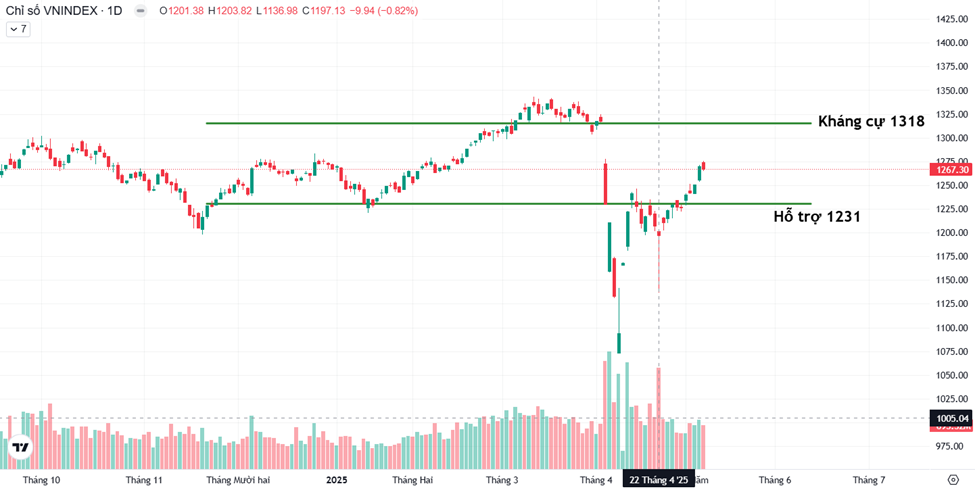 VN-Index đã chạm mốc 1.270 điểm, khả năng thị trường có thể sẽ tiếp tục đà tăng và gặp thử thách vùng kháng cự 1.278 – 1.318 điểm trong tuần. Do đó, áp lực chốt lời sẽ gia tăng khi chỉ số tiến vào kháng cự này, khiến diễn biến thị trường có thể trở nên giằng co với biên độ lớn. Trong ngắn hạn, dòng tiền tập trung vào nhóm cổ phiếu midcap (vốn hóa vừa và nhỏ) , có thể sẽ dịch chuyển dần sang nhóm cổ phiếu ngân hàng. Về mặt trung hạn, nếu không có thông tin bất lợi về thuế quan, VN-Index kỳ vọng vẫn sẽ hướng tới vùng quanh 1.300 điểm.