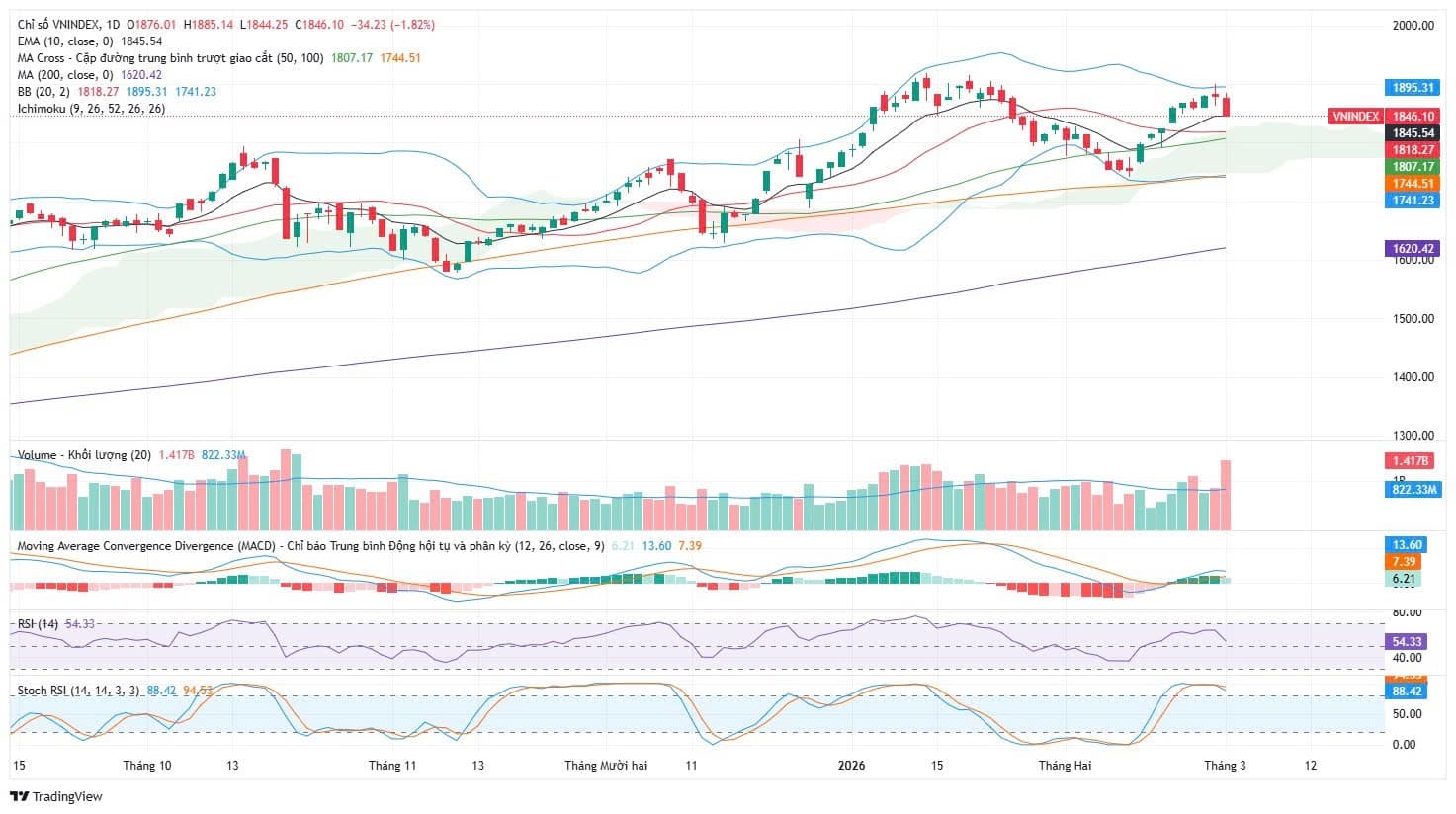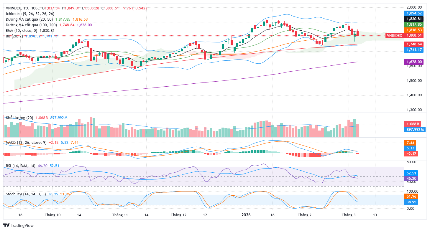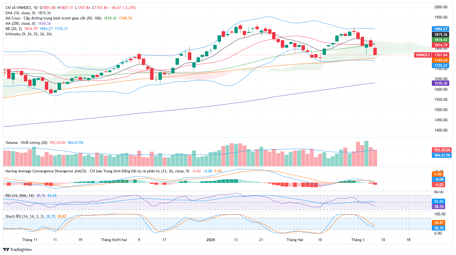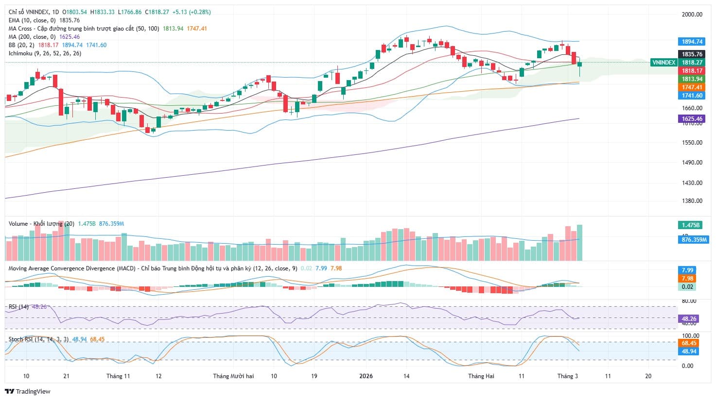 Dự kiến phiên ngày mai thị trường sẽ vẫn tiếp tục giảm theo đà của cuối chiều nay, nhưng vì giảm tiếp sẽ về khu vực 1800 hỗ trợ nên chúng ta sẽ cân bằng lại ở khu vực 1800 hỗ trợ vùng từ 10/2025 tới giờ nhiều lần tết. Và thị trường sẽ nghỉ ngơi chờ thêm thông tin về chiến tranh phía Iran trong tuần này.