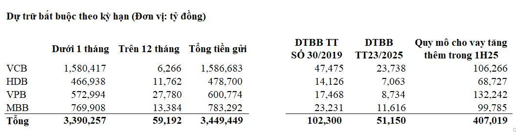 Dữ liệu cuối quý 2/2025 cho thấy, 4 ngân hàng đang nhận chuyển giao có tổng số tiền huy động chịu DTBB khoảng 3,5 triệu tỷ đồng. Khi áp dụng mức giảm mới — từ 3% xuống 1,5% đối với tiền gửi dưới 12 tháng và từ 1% xuống 0,5% đối với kỳ hạn trên 12 tháng. Như vậy có thể cung cấp thêm lượng vốn khoảng 51 nghìn tỷ đồng.
