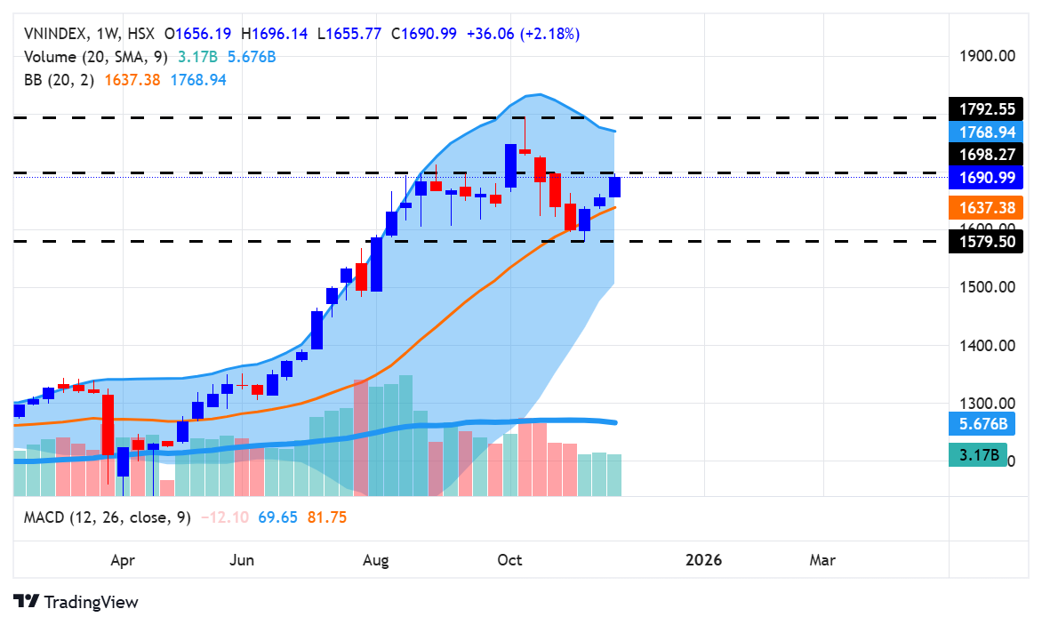 Nhìn vào nến tuần, chúng ta thấy thị trường tăng 2.18%, tương đương khoảng 36 điểm, tiếp tục duy trì giao dịch trên MA20 tuần trong bối cảnh thanh khoản vẫn rất thấp. Tuần này VNINDEX đóng cửa sát mốc 1700, nên khả năng cao tuần sau khi mở cửa sẽ xuất hiện rung lắc do thị trường gặp vùng kháng cự mạnh. Nến tuần này tiếp tục giống với tuần trước, mang lại góc nhìn trung lập khi thị trường vẫn giữ được MA20 nhưng thanh khoản chưa cải thiện.