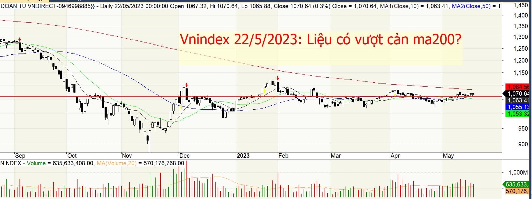 Tính tới phiên nay, vnindex đã đi ngang biên hẹp( giao động phiên không quá 15 điểm) trong 6 phiên trở lại đây. Đóng phiên chỉ số ở vùng 1070 với volume giảm không nhiều so với cuối tuần trước và trên trung bình 20 phiên.