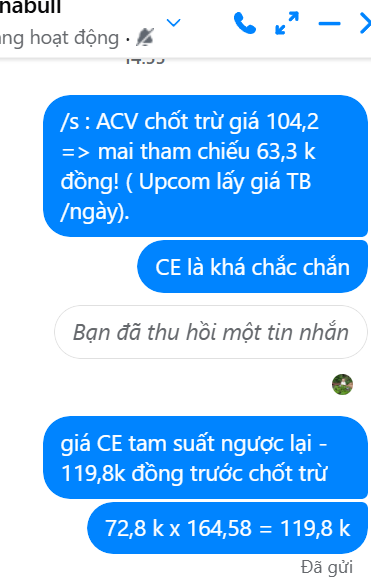 P/s : ACV chốt trừ giá 104,2 => mai tham chiếu 63,3 k đồng! ( Upcom lấy giá TB /ngày).