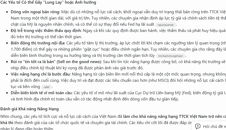 Khả năng nâng hạng TTCK Việt Nam vẫn đang rất sáng sủa và có cơ sở vững chắc nhờ những nỗ lực cải cách và hoàn thiện thể chế đáng kể. Các yếu tố gây “lung lay” chủ yếu mang tính thời điểm, tâm lý thị trường hoặc các yếu tố bên ngoài, chứ không phải do thiếu sót về tiêu chí nâng hạng. Việc quan sát phản ứng của dòng vốn ngoại và sự duy trì các cải cách sau khi có quyết định nâng hạng sẽ là những điểm then chốt cho sự phát triển bền vững của thị trường 24hmoney.