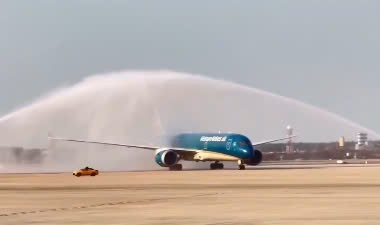 Ảnh : màn chào mừng chuyến bay … đầu tiên đáp “thử” sb Long Thành,chiều qua 15/12.
