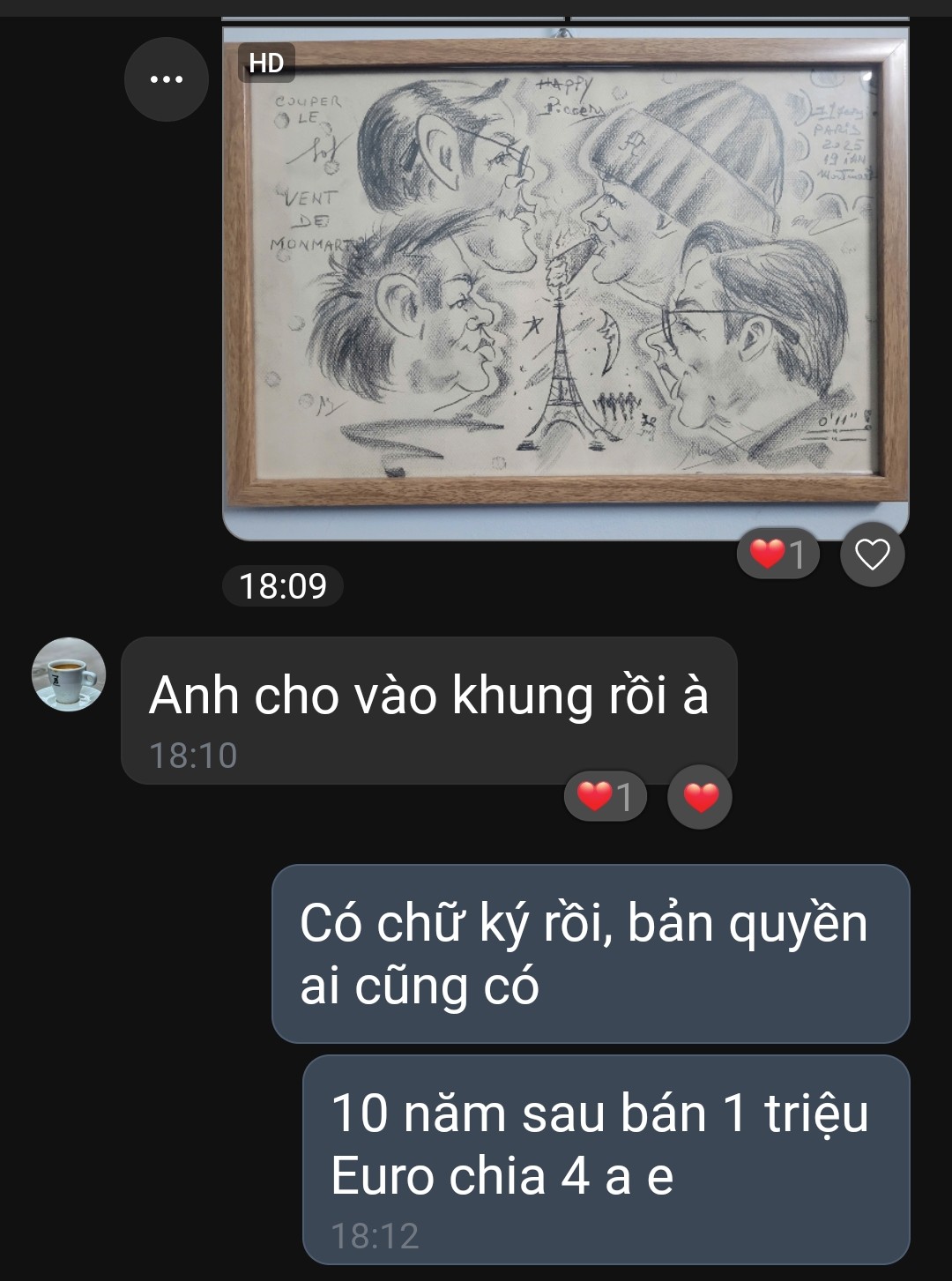 E và a nếu gặp nhau ở Hồ Gươm HN buổi tối sẽ có bức hình ký họa 3 ae, như bọn a ở đồi Montmartre Paris cách đây gần 1 tháng
