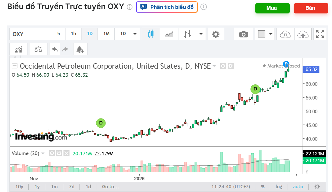 Trong khi phần lớn sự chú ý đã tập trung vào nơi khác, các cổ phiếu năng lượng được chọn lọc đã lặng lẽ bùng nổ, đặc biệt là đối với những người định vị sớm. Nhiều thành viên InvestingPro đã đi trước xu hướng, sử dụng nền tảng đăng ký của chúng tôi cung cấp các lựa chọn cổ phiếu được hỗ trợ bởi AI, các công cụ dữ liệu nâng cao và thông tin chi tiết về thị trường toàn cầu để xác định cơ hội sớm. Nếu bạn đã là thành viên InvestingPro, các lựa chọn cổ phiếu mới nhất của bạn đã sẵn sàng để xem bên trong bảng điều khiển của bạn. Một trong những ví dụ rõ ràng nhất hiện nay là Occidental Petroleum (OXY). Cổ phiếu này tăng 21,83% tính đến nay trong tháng, bao gồm mức tăng 6% chỉ riêng tuần này, và đã tăng khổng lồ 56,2% kể từ khi được AI của chúng tôi chọn vào đầu năm.