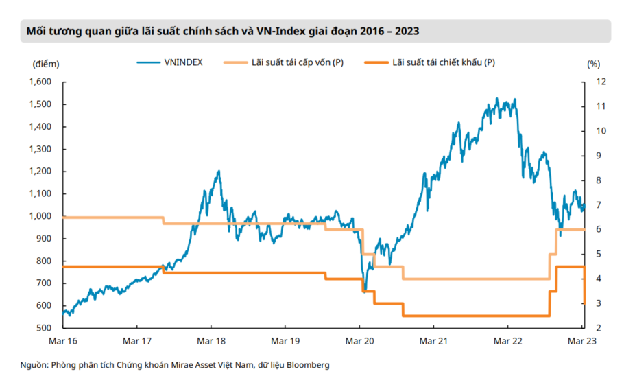 Về câu chuyện lãi suất: Lần đầu tiên kể từ tháng 10/2020 Ngân Hàng Nhà Nước (NHNN) thực hiện cắt giảm lãi suất điều hành và động thái này đã đảo ngược xu hướng tăng lãi suất trước đây của Việt Nam, với lần tăng lãi suất gần nhất là vào tháng 10 năm ngoái. Trong báo cáo mới cập nhật, Chứng khoán Mirae Asset cho rằng đây là động thái quyết đoán và chủ động trước của NHNN trong bối cảnh các ngân hàng trung ương trên thế giới vẫn đang rục rịch tăng lãi suất. Lãi suất điều hành giảm kỳ vọng thúc đẩy các ngân hàng thương mại chủ động giảm lãi suất huy động, từ đó hạ lãi suất cho vay giảm thiểu chi phí đầu vào cho doanh nghiệp, hộ gia đình, thúc đẩy các hoạt động sản xuất kinh doanh. Đồng thời, việc Ngân hàng Nhà nước hạ trần lãi suất cho vay ngắn hạn sẽ giúp doanh nghiệp và người dân các lĩnh vực ưu tiên có thể tiếp cận vốn vay thấp hơn, giải tỏa một phần áp lực lãi vay cao khi huy động vốn.