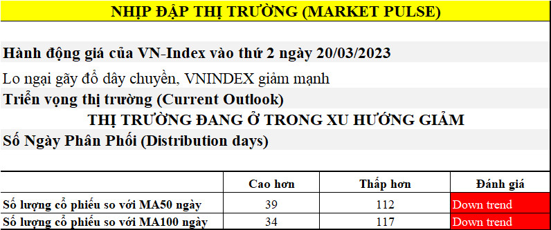 Thị trường đã nằm dưới đường trung bình MA50 ngày, vì thế xu hướng thị trường đang là ở trong xu hướng giảm. Trader được khuyến nghị hạ tỷ trọng cổ phiếu, ít nhất là phần margin và mạnh dạn cắt lỗ các khoản đầu tư khi khoản lỗ còn thấp. Né tránh rủi ro còn đỡ hơn là phải đi xử lý rủi ro.