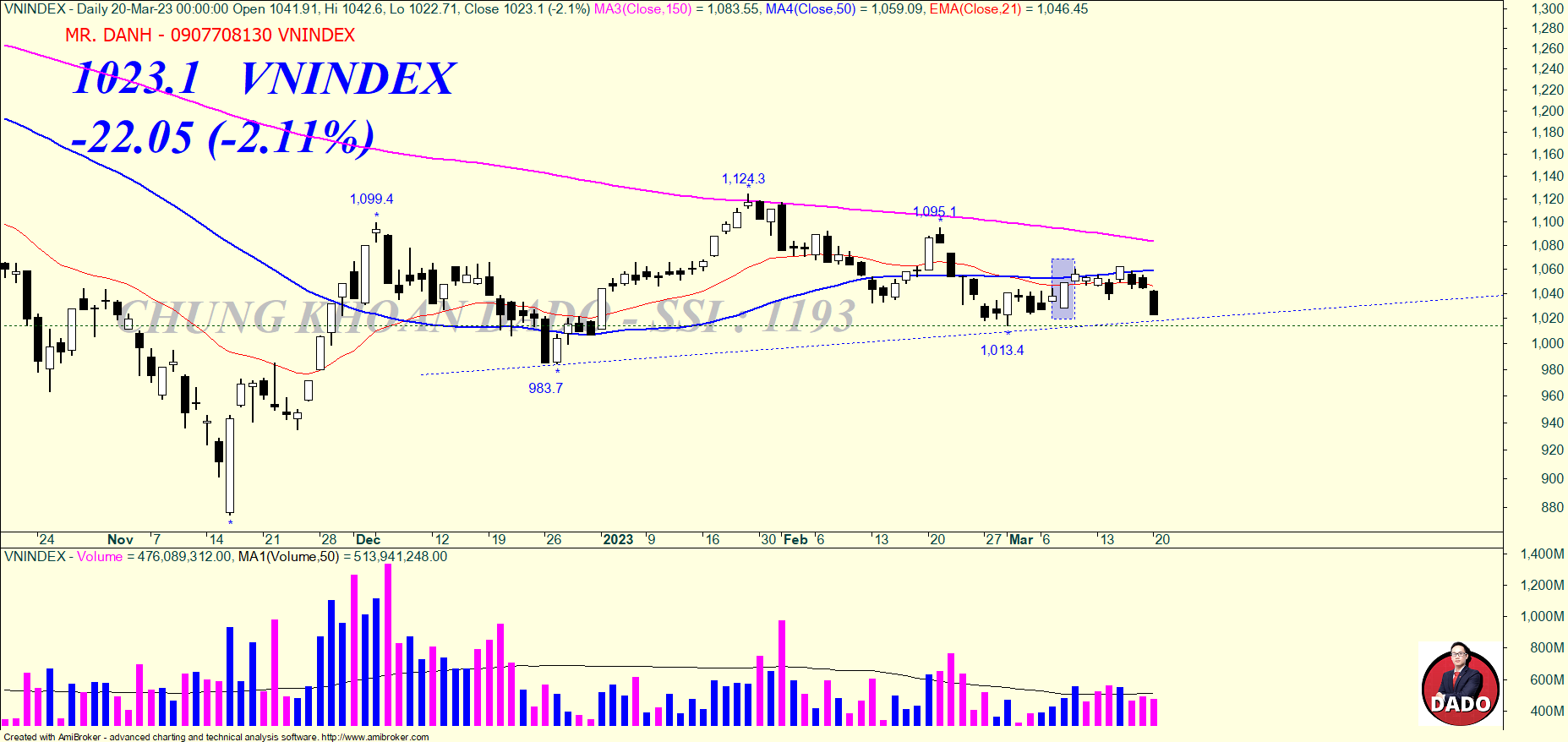 VNINDEX có phiên giảm điểm mạnh, đóng cửa thấp nhất phiên đạt 1023. Mặc dù thanh khoản chỉ là 476 triệu cổ phiêu và vẫn thấp hơn ngày hôm qua, tuy nhiên tâm lý tiêu cực đã bao trùm từ ngay phiên giao dịch buổi sáng.