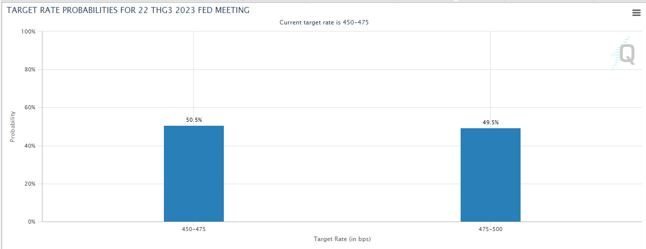 Ngoài ra, tâm lý nhà đầu tư thận trọng trước cuộc họp của Fed vào ngày 20 - 21/03 tới đây. Hiện tại xác suất FED sẽ tăng lãi suất lên 0.25% hay 0.5% là 50% - 50%. Trong trường hợp Fed giữ mức tăng 50 điểm phần trăm, giá trị các khoản trái phiếu đầu tư của các ngân hàng đầu tư (Investment Banking) có thể tiếp tục giảm giá và khiến nhiều ngân hàng gặp khó khăn trong việc cơ cấu nguồn vốn. Thị trường sẽ chờ đợi những động thái rõ ràng của Fed trước khi xuống tiền mua bán cổ phiếu.