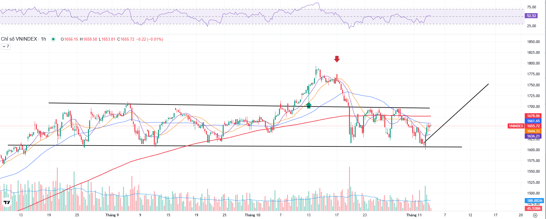 Thị trường hồi phục tốt sau khi về mốc hỗ trợ là 1600 với trạng thái là lan tỏa hầu hết nhóm ngành, và tăng mạnh với những nhóm đã chiết khấu sâu từ trước đó là chứng khoán và bất động sản. Như vậy giữ được trên mốc này Thị trường tiếp tục đi lên biên trên hướng đến 1700 điểm. Kháng cự vùng cung trên này là khá lớn, khi lên lại bị bán với 4 lần từ tháng 8 đến giờ (đang là đi trong biên 1600 - 1700)