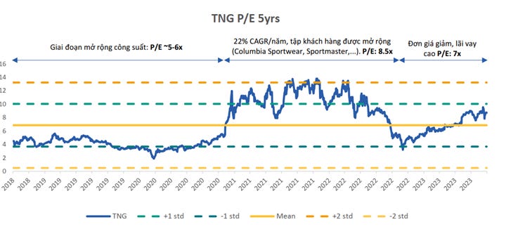 Định giá : P/E trung bình ngành ở mức 9 lần và trung bình chu kỳ trước là 8,5 lần, mức định giá hiện tại đã chiết khấu sau khi chia cổ tức tiền của TNG quanh 8 lần – dư địa upside thời gian tới vẫn có nhưng không quá vượt trội.