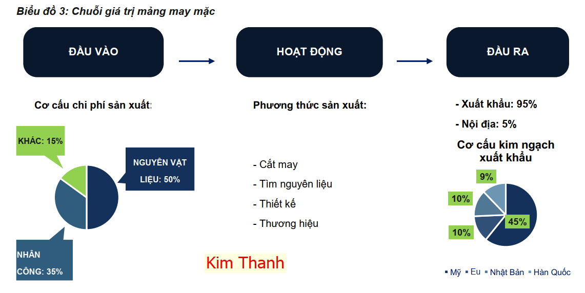 Đầu ra: 4 thị trường chính là Mỹ (45%), EU (10%), Nhật Bản (10%) và Hàn Quốc (9%)