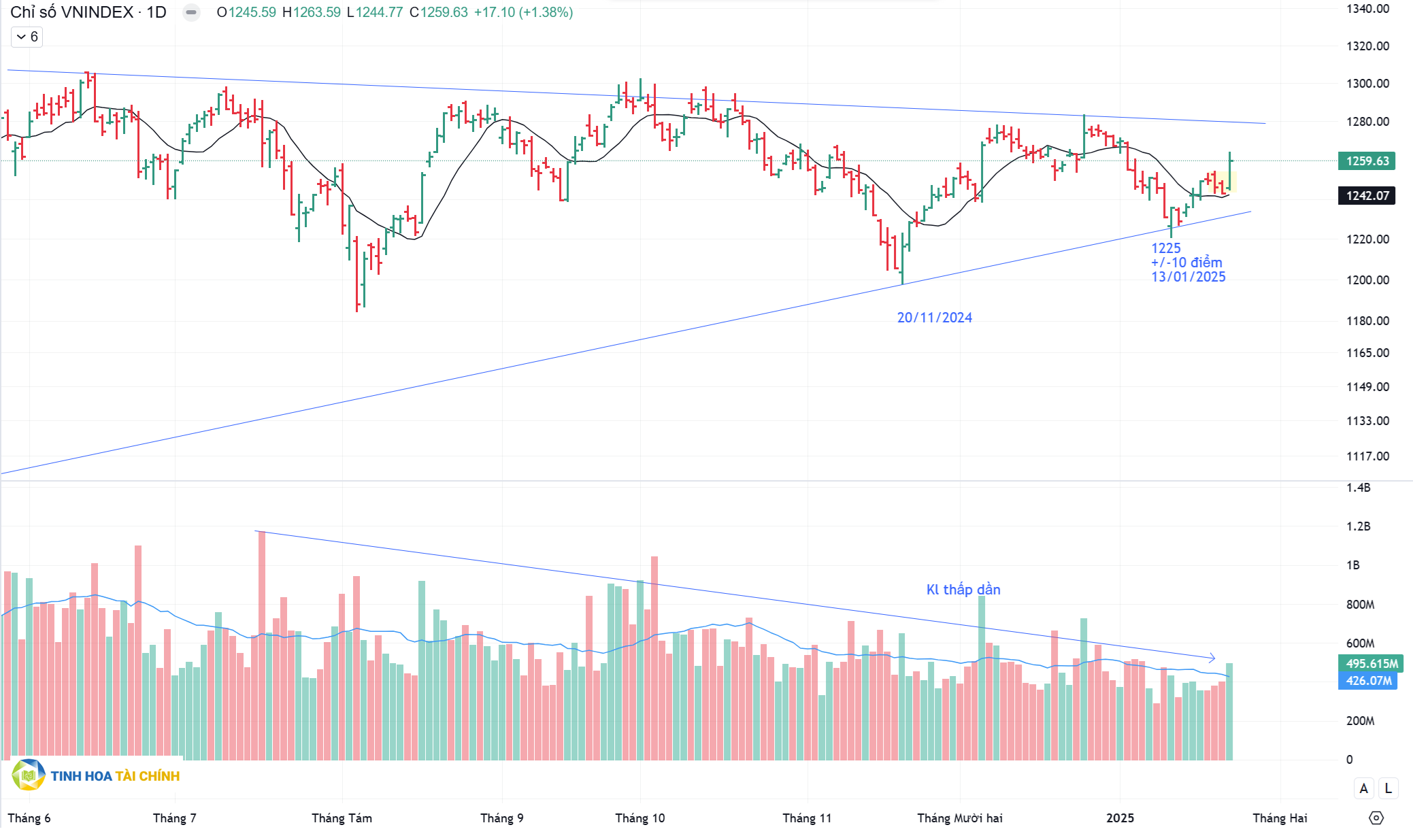 Với bố cảnh thị trường chung vẫn đi ngang trong vùng biên 1166 điểm đến 1300 điểm từ tháng 3 năm 2024 đến thời điểm hiện tại thì đây là 1 vùng tích lũy đủ dài để kỳ vọng 1 nhịp tăng giá sau tết âm. Như vậy khả năng đáy lớn của thị trường đã có ở ngày 20.11.2024 và nhịp rũ xuống quanh 13.01.2025 là nhịp đáy mb của nhịp tăng này. Xem chi tiết hơn ở bài viết: Đáy lớn của thị trường thường rơi vào tháng 11 trong 2 năm vừa qua, đón chào 6 tháng đầu năm 2025 rực rỡ.