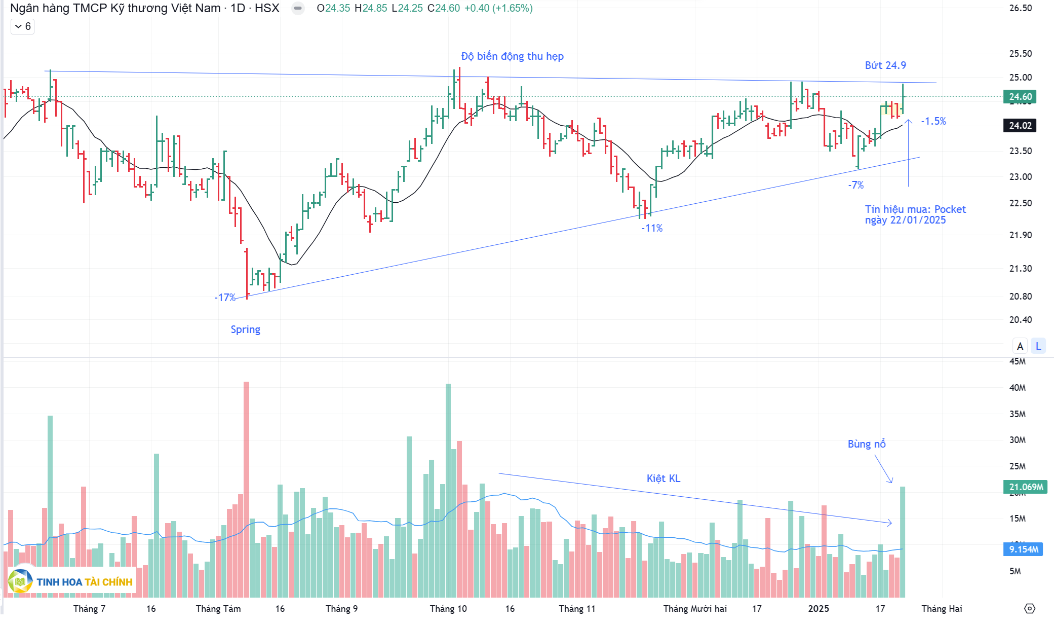 Nhóm ngành ngân hàng theo kinh nghiệm của Huấn thì vẫn nên ưu tiên những cổ phiếu đang tăng giá mạnh hoặc nằm ở kênh trên, đừng vì định giá P/B thấp mà lựa chọn những cổ phiếu chưa có trend. Có thể tham khảo thêm TCB với tín hiệu mau pocket trong nên ngày 23/01/2025. Cổ phiếu này đang cách vùng đỉnh 52 tuần 2.38% và cổ phiếu có mẫu hình độ biến động thu hẹp với 4 lần thu hẹp -17%, -11%, -7%, -1.5%. Điểm xác nhận của TCB ở nhịp này quanh 24.9 và điều quan trọng hơn là nhóm ngân hàng đang đủ điều kiện trở thành nhóm ngành dẫn dắt thị trường nên đây cũng là thời điểm để cược vào những cổ phiếu mạnh. Riêng TCB nhịp tăng giá này khó bật tăng nhẹ nhàng như LPB nhưng đây cũng là sự lựa chọn tốt thứ 2 vì bản chất đặc thù tạo lập của cổ phiếu trong quá khứ.