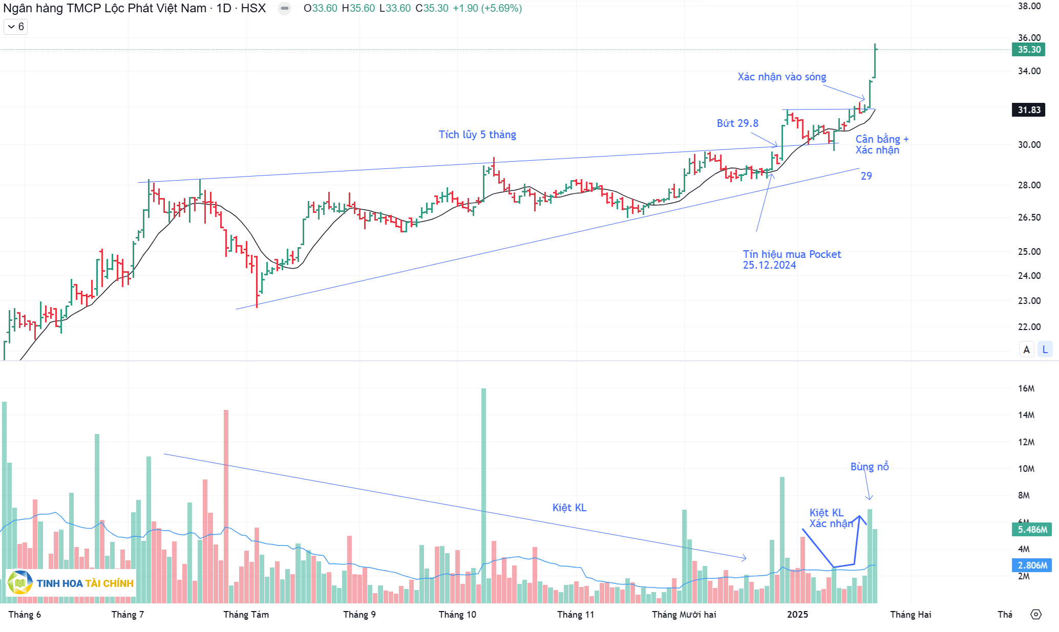 Đánh giá về nhóm cổ phiếu ngành ngân hàng thì hiện tại chỉ có 1 cổ phiếu chạy nước rút là LPB. Còn các cổ phiếu còn lại bản chất vẫn đang set up nhịp tăng giá đồng đều của nhóm ngành. Đương nhiên việc ưu tiên nguồn lực vẫn nên tập trung ở cổ phiếu LPB khi cổ phiếu xuất hiện tín hiệu mua trong nền giá đi con đường tốn ít chi phí ngày 25.12.2024 và trong quá trình cân bằng trên của cổ phiếu cũng có mẫy hình Rũ - Kiệt khối lượng và Xác nhận để báo hiệu cổ phiếu vào giao đoạn chạy nước rút. Nếu nhà đầu tư mua và nắm giữ cổ phiếu trước thời điểm cổ tức 16,8% thì hiện tại với mức giá sau chia của LPB đang có lợi nhuận hơn 35% trong vòng 1 tháng vừa qua.