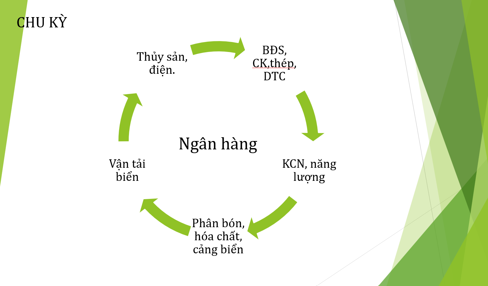 Theo vòng xoáy mang tính chất chu kỳ thì nhóm cổ phiếu ngân hàng sẽ làm nhiệm vụ khởi tạo cho 1 nhịp tăng giá mới và quan trọng hơn là sự lan tỏa dòng tiền sang các nhóm ngành như bất động sản, chứng khoán, thép, đầu tư công … và tiếp tục vòng lặp dòng tiền cho đến khi kết thúc ở nhóm chu kỳ là thủy sản, điện hoặc phân bón - hóa chất…