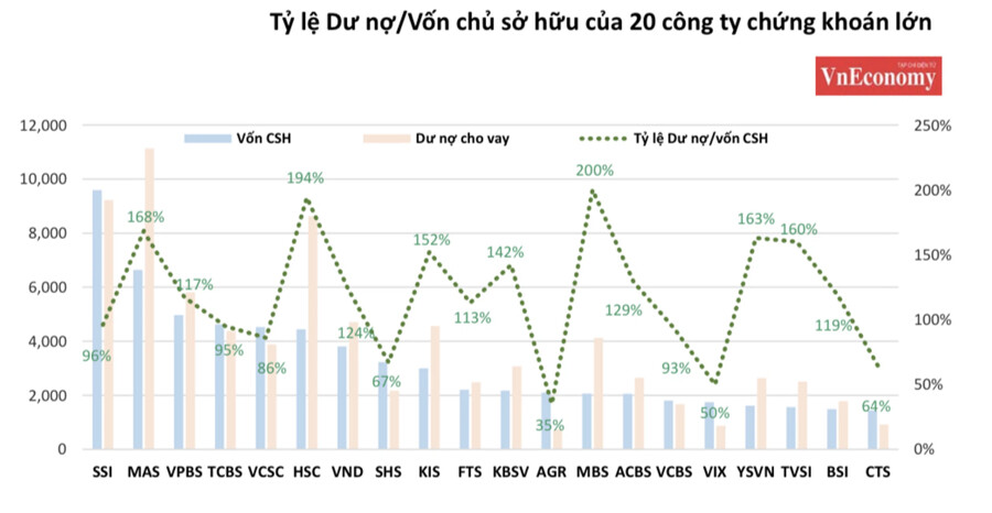 Theo thống kê của chứng khoán Agriseco, vào cuối năm 2020, tỷ lệ dư nợ cho vay/vốn chủ sở hữu tại chứng khoán Yuanta đã lên tới 163%, Mirae Asset ở mức 168%; tại HSC và MBS con số này đã xấp xỉ ngưỡng tối đa 200%. Điều này có nghĩa các công ty chứng khoán sẽ khó có thể cho vay thêm nếu không gia tăng vốn chủ sở hữu.