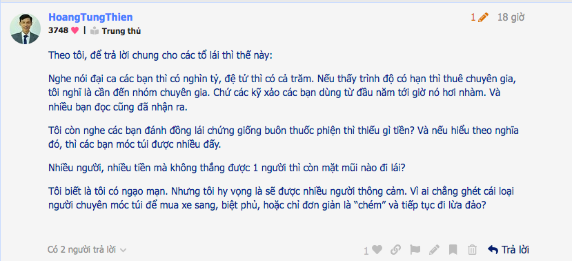 Tôi cũng đã đọc bài viết và cả bình luận của A7 trên F247 với tiêu đề “Tin sốc! A7 chuyển sang Lào đánh chứng”. Nếu cảm nhận câu từ của bài viết có vẻ anh ta đang khá “nghiêm túc”, một vài bình luận cũng vậy. Không biết các “học trò” của A7 thiếu kiến thức hay vì đang ôm L14, CEO, và DIG nên mới “té nước theo mưa”?