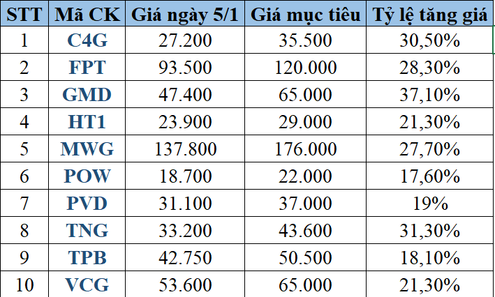 10 cổ phiếu tiềm năng nhất cho tháng 1 năm 2022 được Agriseco lựa chọn (Nguồn số liệu: Agriseco)