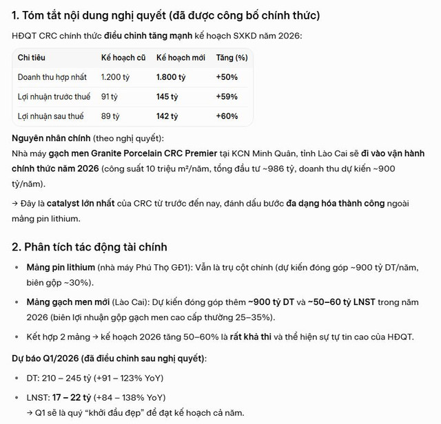 Mảng gạch men mới (Lào Cai): sẽ đi vào vận hành chính thức năm 2026 (công suất 10 triệu m²/năm Dự kiến đóng góp thêm ~900 tỷ DT và ~50–60 tỷ LNST trong năm 2026 (biên lợi nhuận gộp gạch men cao cấp thường 25–35%)