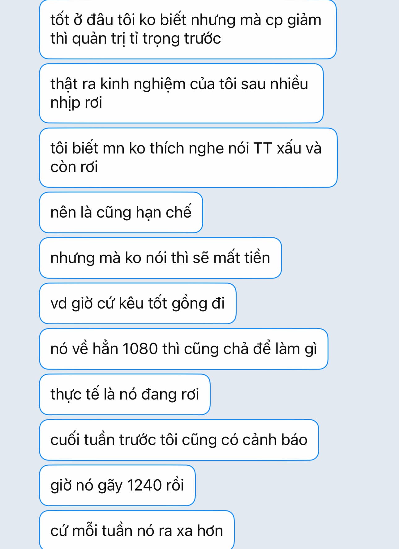 Thì kệ họ thôi em bản chất tất cả cũng là tâm lý thôi mà. Giảm từ 1290 đến 1218 tk a cũng đâu lỗ giờ giảm thêm cũng kệ thôi
