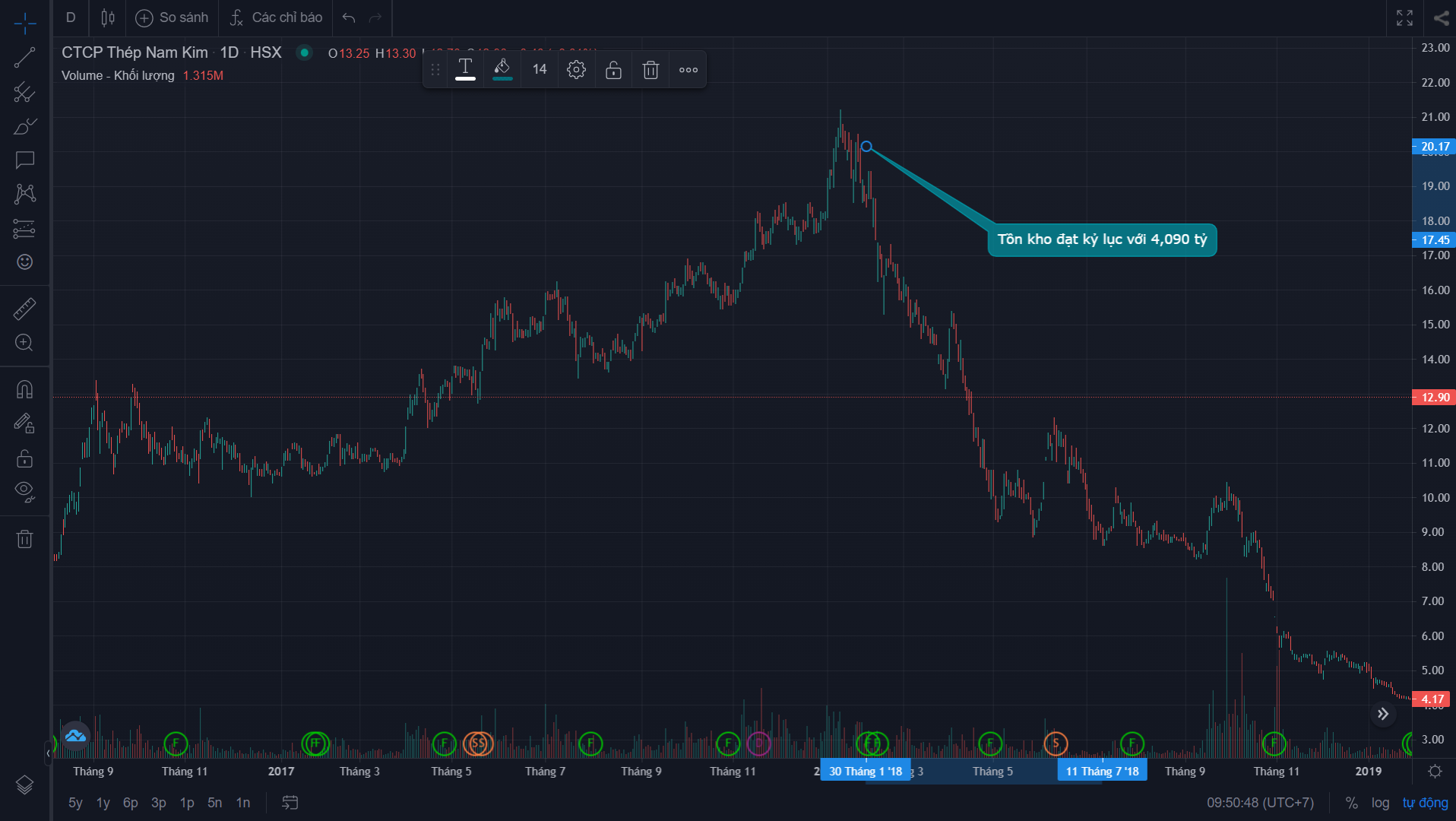 Số liệu BCTC công bố cuối năm 2017 vào thời điểm nhu cầu thép giảm mạnh cực kỳ xấu xí với tâm điểm là số ngày tồn kho cao nhất trong lịch sử với 123 ngày, tổng nợ đạt mức kỷ lục là 6,200 tỷ đồng, tương đương với hệ số nợ/VCSH là 2.1 lần. Như vậy, nếu chúng ta thấy rằng chính sách tiền tệ bắt đầu thắt chặt, nhu cầu về thép suy giảm kéo theo giá HRC giảm thì rất có khả năng giá cổ phiếu NKG sắp tạo đỉnh.
