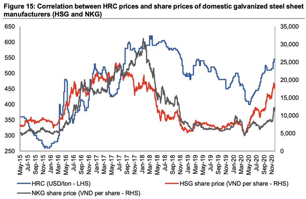 - Như vậy, chu kỳ tăng giá mạnh của NKG phần lớn bắt nguồn từ đà tăng của giá HRC, do đó khi đầu tư NKG nhà đầu tư cần phải theo dõi diễn biến giá HRC, cộng thêm với các yếu tố vĩ mô trên thế giới, đặc biệt đến từ chính sách tiền tệ nới lỏng.