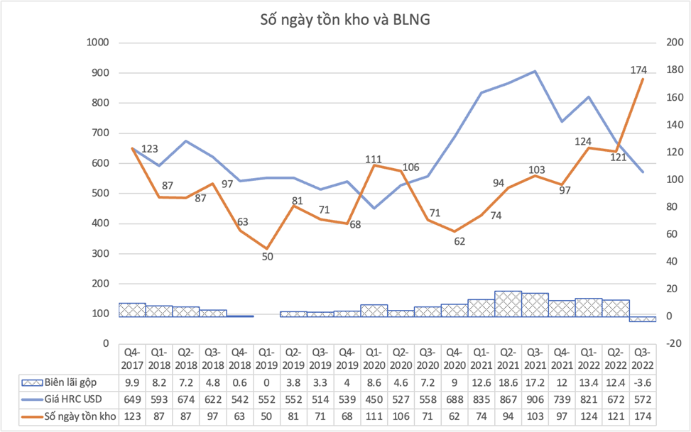 Các dấu hiệu NKG đạt đỉnh xuất hiện khi chính sách tiền tệ thắt chặt, giá HRC tạo đỉnh sau thời gian tăng mạnh, kéo theo số ngày tồn kho ở mức cao (>120 ngày) cùng nợ vay gia tăng tài trợ cho hàng tồn kho hoặc mở rộng công suất. Các yếu tố này khiến cho BLNG giảm mạnh và KQKD xấu xí sẽ dần hiện rõ ngay sau đó.